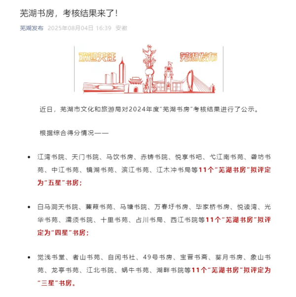 權(quán)威發(fā)布!根據(jù) “蕪湖發(fā)布”官方公示(2025年8月4日) 及 《2024年度“蕪湖書房”考核結(jié)果公示》鏡湖書苑在蕪湖市文化和旅游局的嚴(yán)格考核中表現(xiàn)卓越,成功躋身 “五星書房” 行列!