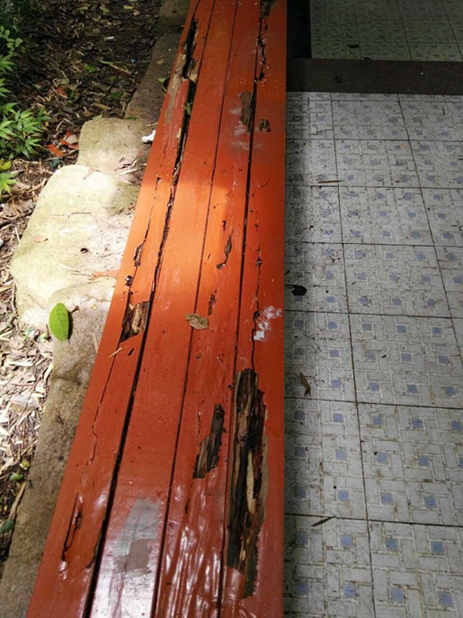 文明城市創(chuàng)建迎檢期間,公司對赭山公園內(nèi)的基礎(chǔ)設(shè)施進行全面檢查,檢查中發(fā)現(xiàn)公園長廊有部分座椅腐爛,在維修過程中發(fā)現(xiàn)長廊座椅下有少量白蟻,因此,公司立即與白蟻防治所聯(lián)系。