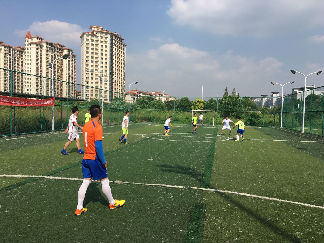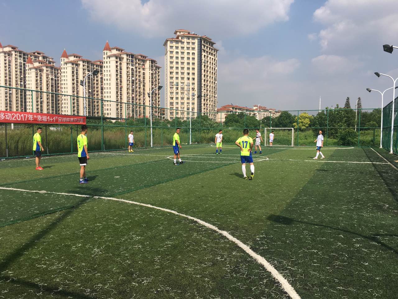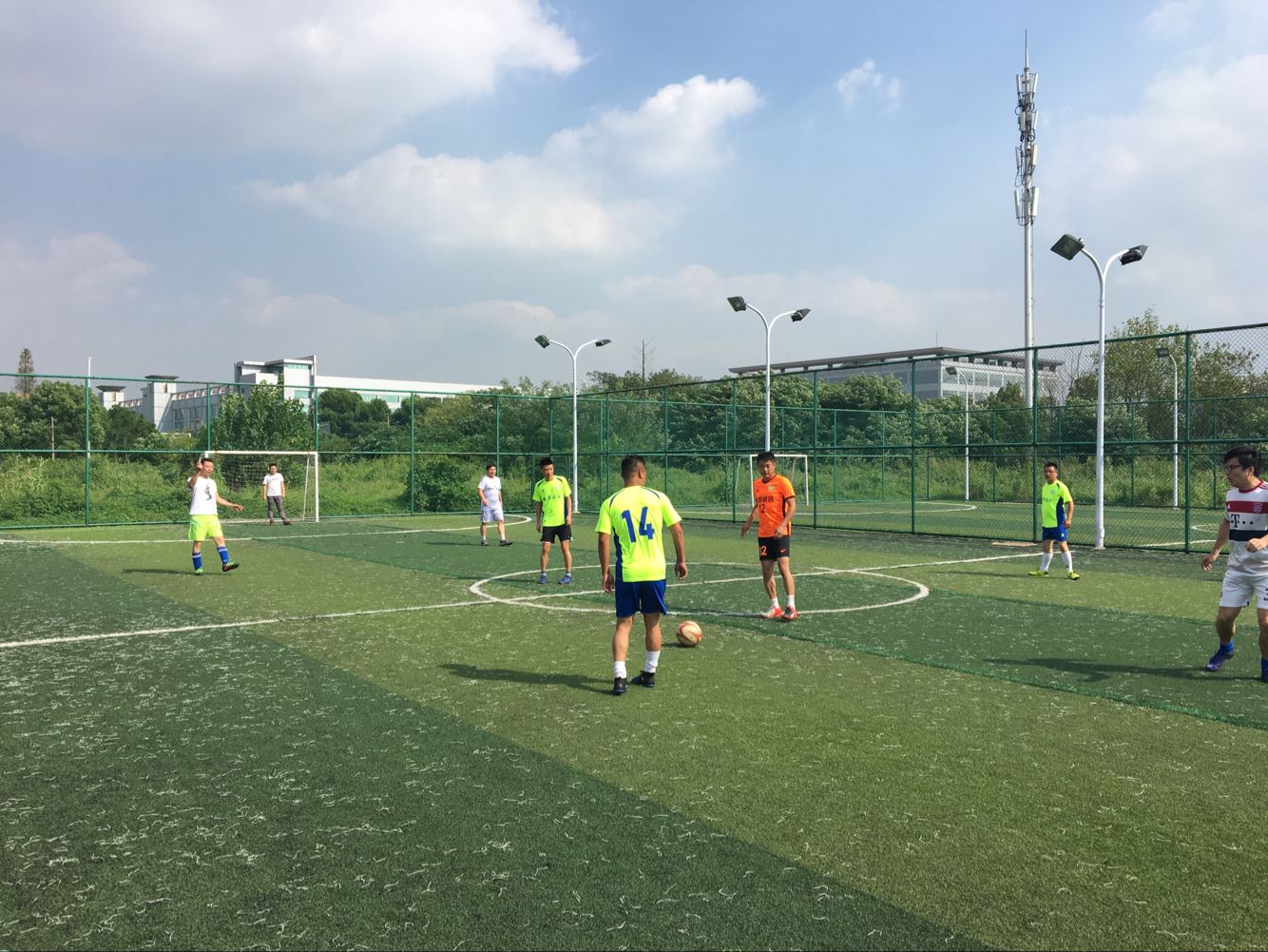 賽場上,隊員們激烈拼搶,盡情發(fā)揮球技,搶斷、過人、射門、撲救……精彩場面一個接一個,大家你追我趕,奮力馳騁,大有“球場爭鋒,舍我其誰”之勢;場上比賽進行得如火如荼,場下各方啦啦隊員們也不甘示弱,都發(fā)揮著自己最大的能量,加油聲此起彼伏,為隊員們助威。大家快樂地享受著90分鐘的比賽時光,最終比賽在歡聲笑語中結(jié)束,城市園林集團足球隊略勝一籌。