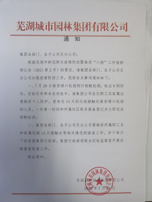 7月20日,南京祿口機場例行核酸檢測,檢出9例陽性。情況發(fā)生后,園林集團黨委高度重視。結(jié)合市新冠疫情防控暨推進“六穩(wěn)”工作指揮部(2021第2號)文件精神,集團公司主要領(lǐng)導(dǎo)第一時間作出批示,立即啟動《園林集團新冠從嚴快速做好各項防控措施》。