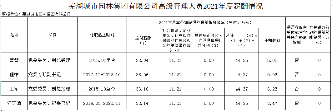 2021年度蕪湖城市園林集團(tuán)企業(yè)負(fù)責(zé)人薪酬披露