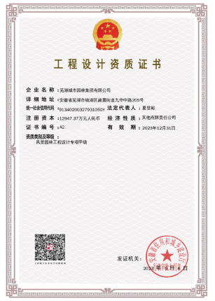 •    近日,蕪湖城市園林集團通過安徽省住建廳資質(zhì)申報的各項審核,成功取得風(fēng)景園林工程設(shè)計專項甲級資質(zhì),標(biāo)志著園林集團成為蕪湖市第三個擁有風(fēng)景園林設(shè)計甲級資質(zhì)的企業(yè)。