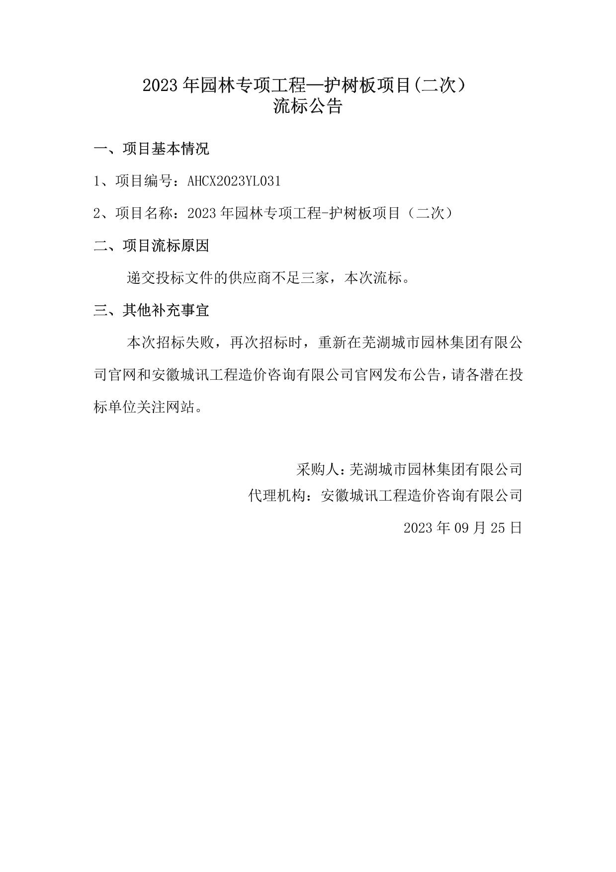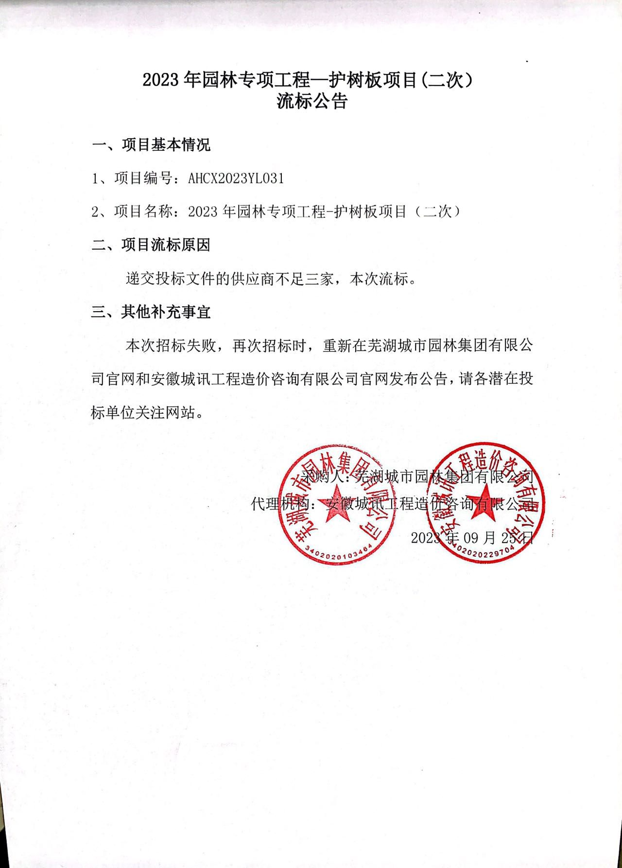 2023年園林專項工程—護樹板項目(二次)流標公告